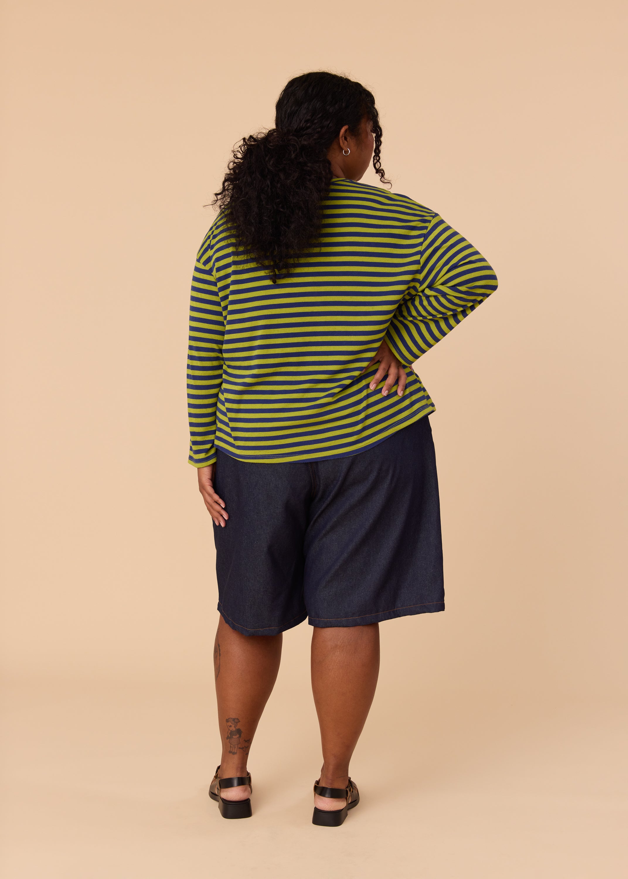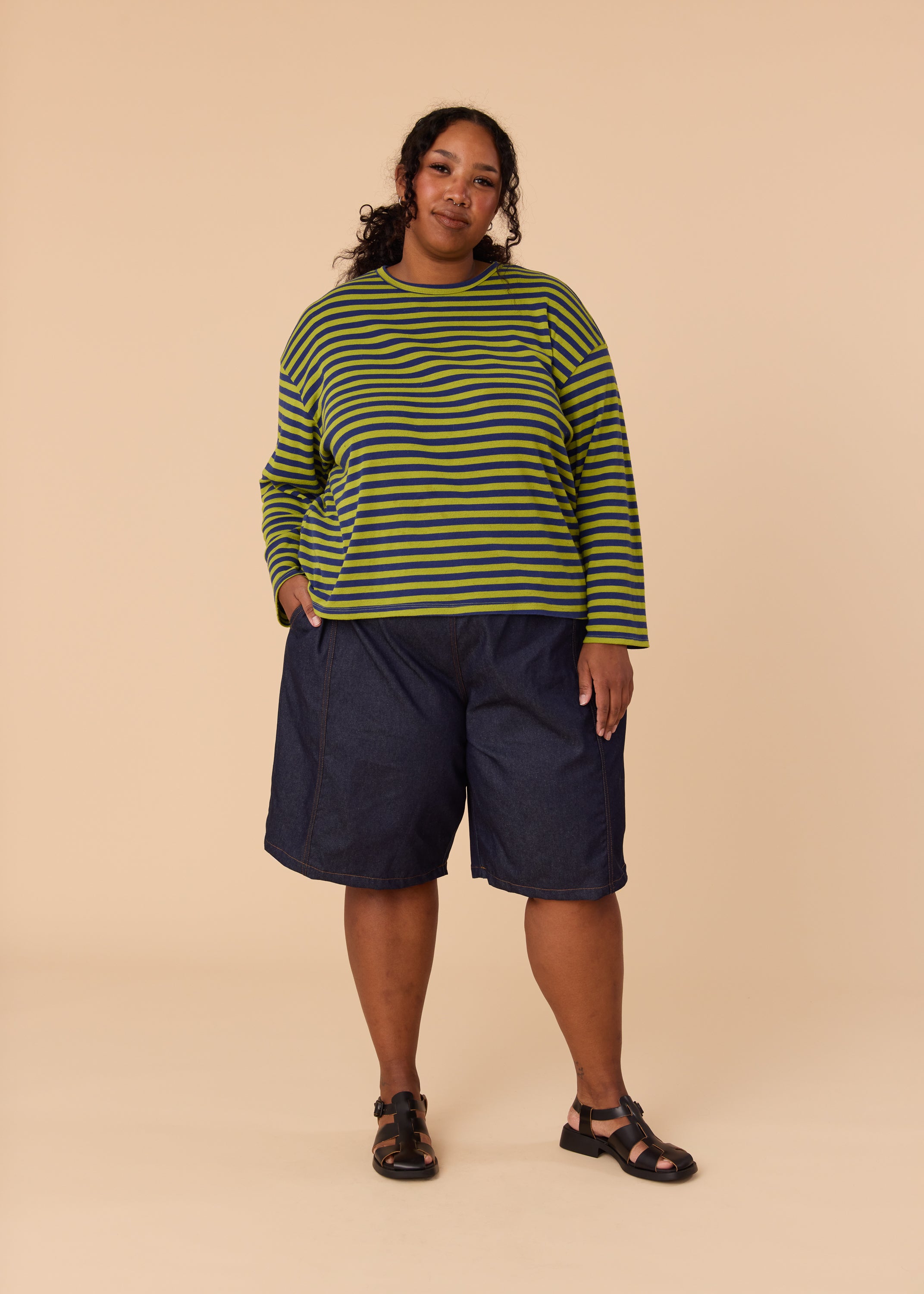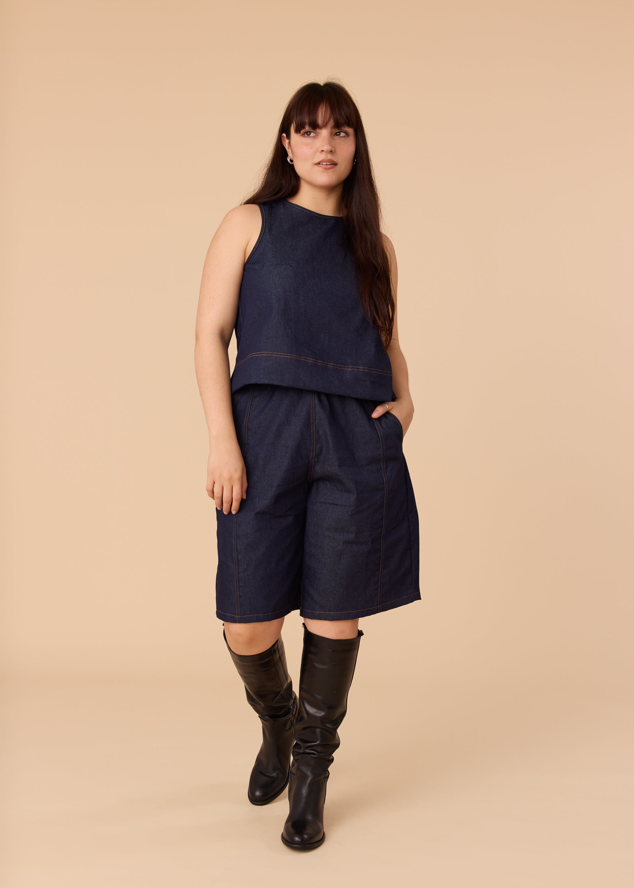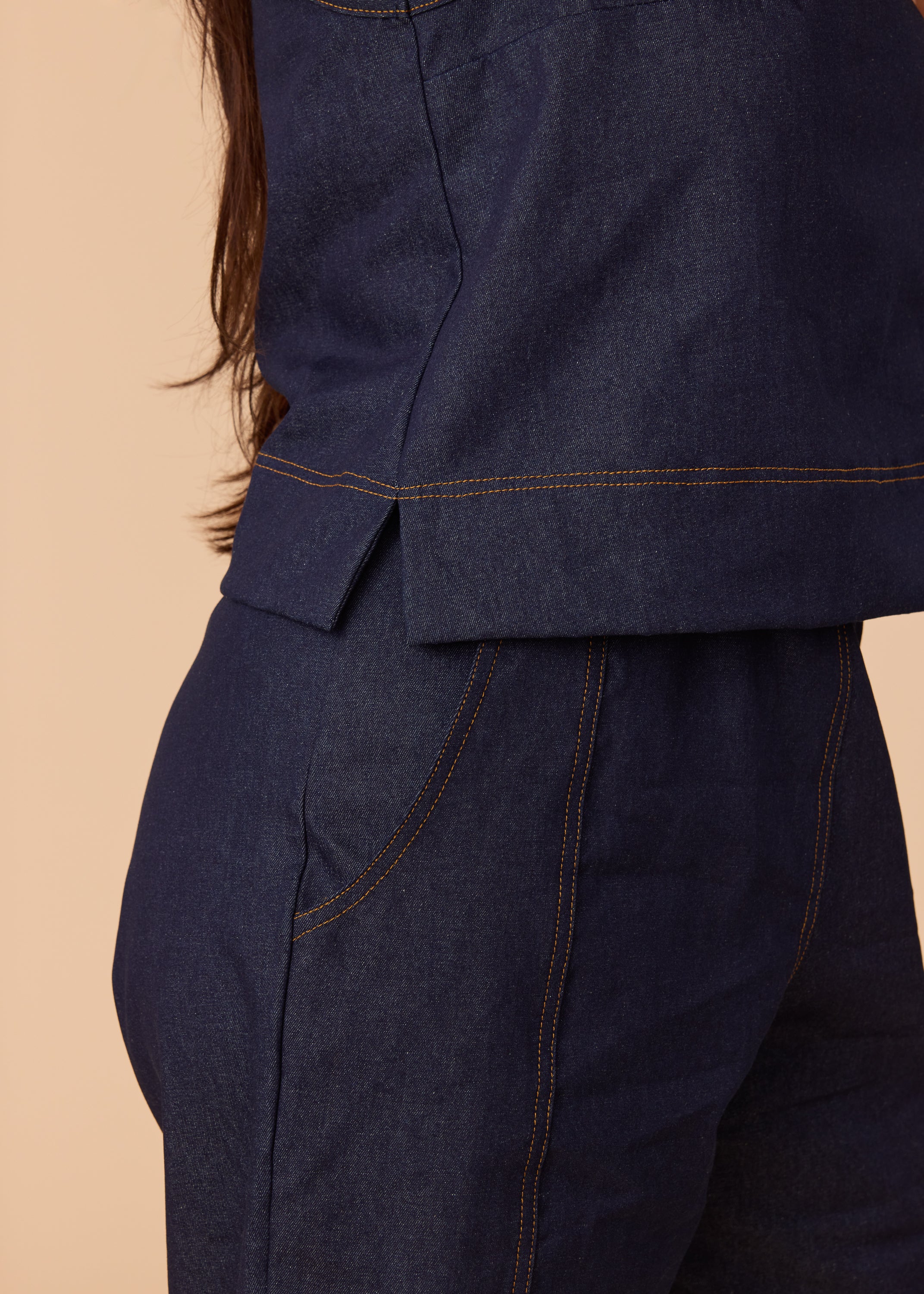 • Decorative flat felled seams in contrasting thread (gold denim thread on Indigo, brown on Natural)